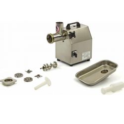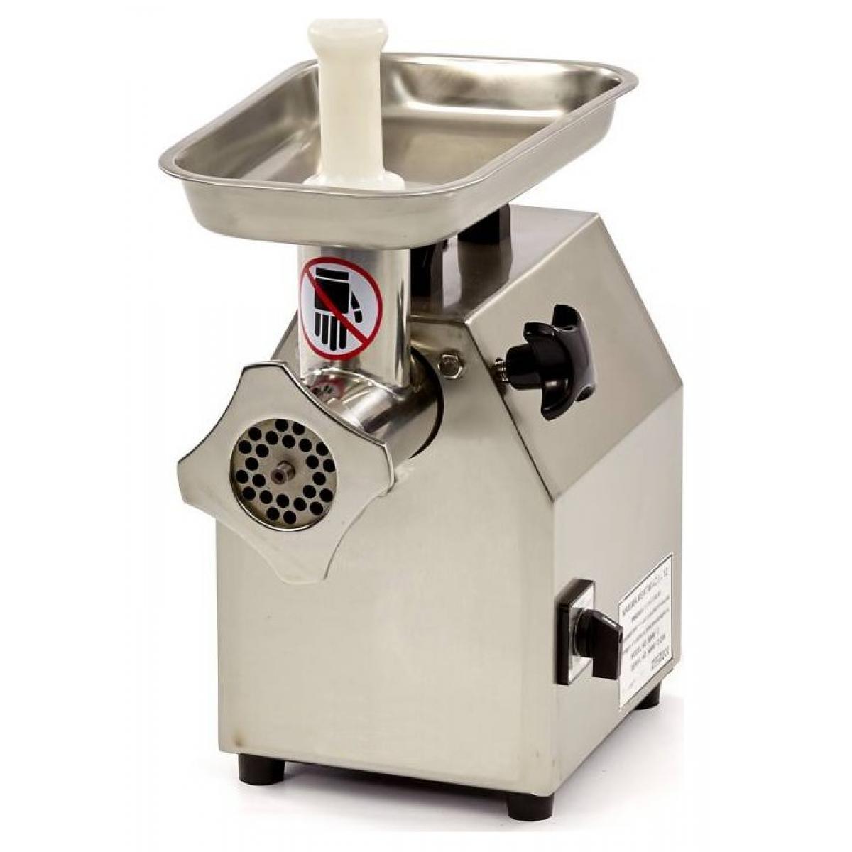 Hachoir à viande professionnel puissant avec boîtier en acier inoxydable ainsi que toutes les parties de contact alimentaire. Il dispose de quatre pieds en caoutchouc pour une garantie contre le glissement.